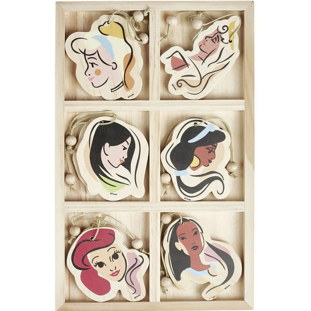 Lot de 12 décorations de Noël en bois représentant les princesses Disney Cendrillon, Aurore, Mulan, Jasmine, Ariel et Pocahontas à suspendre partout dans la maison.