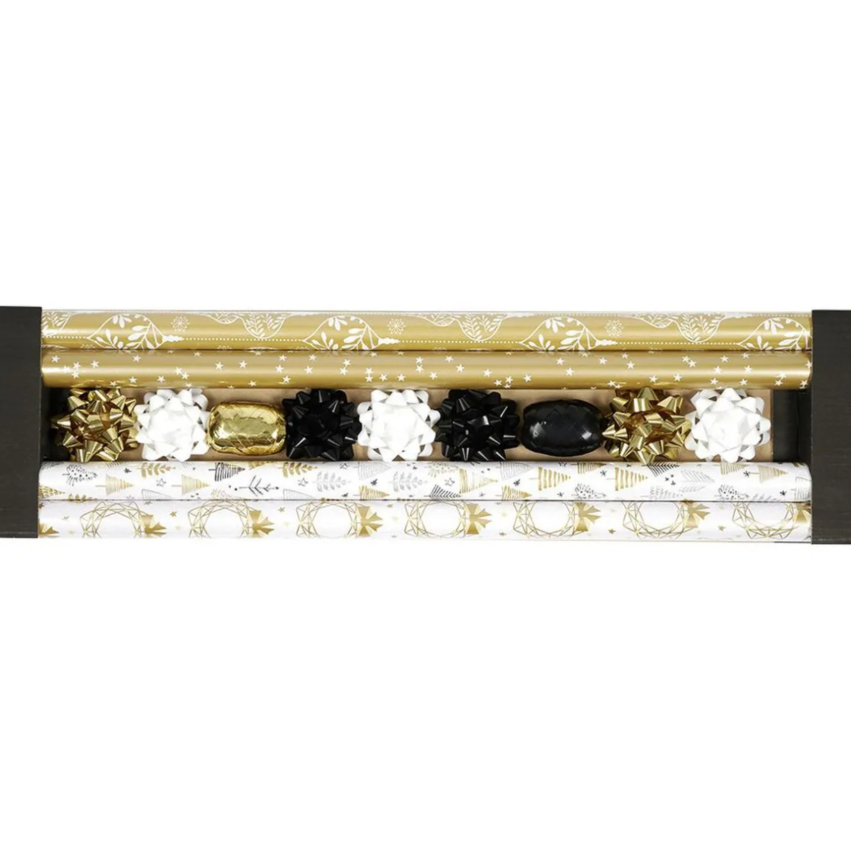 Ensemble de 4 rouleaux de papier cadeau blancs et dorés, de 7 noeuds dorés, noirs et blancs et de 2 bolducs doré et noir, pour passer un matin de Noël ensoleillé.