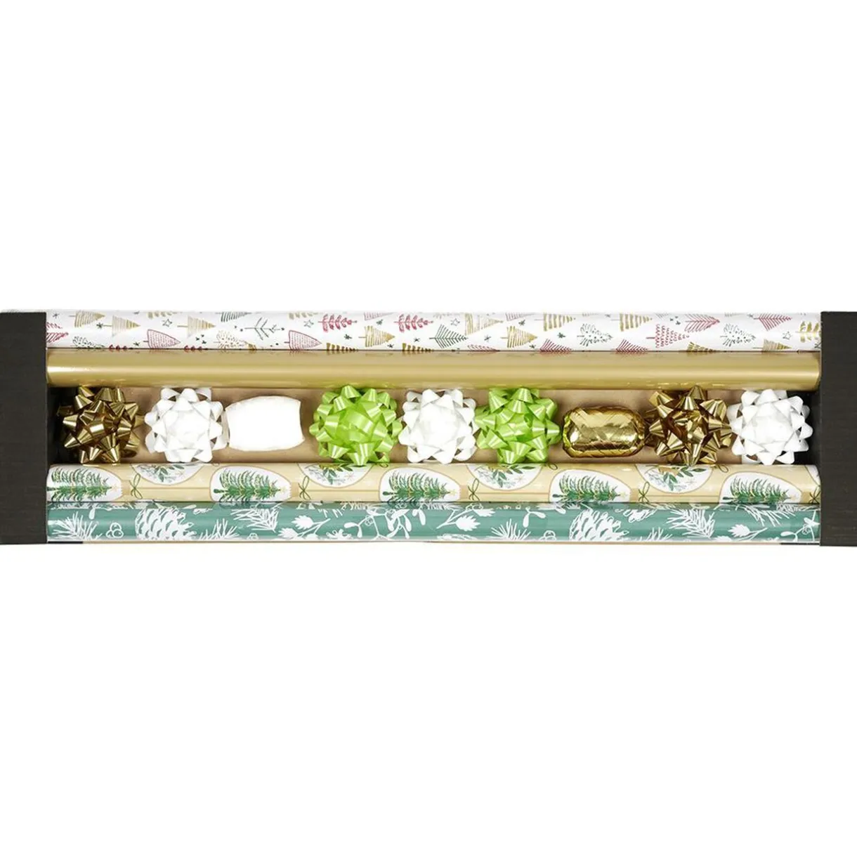 Ensemble de 4 rouleaux de papier cadeau sur le thème de la nature avec 7 noeuds dorés, verts et blancs, 2 bolducs dorés et blancs, pour un matin de Noël avec une note fleurie.