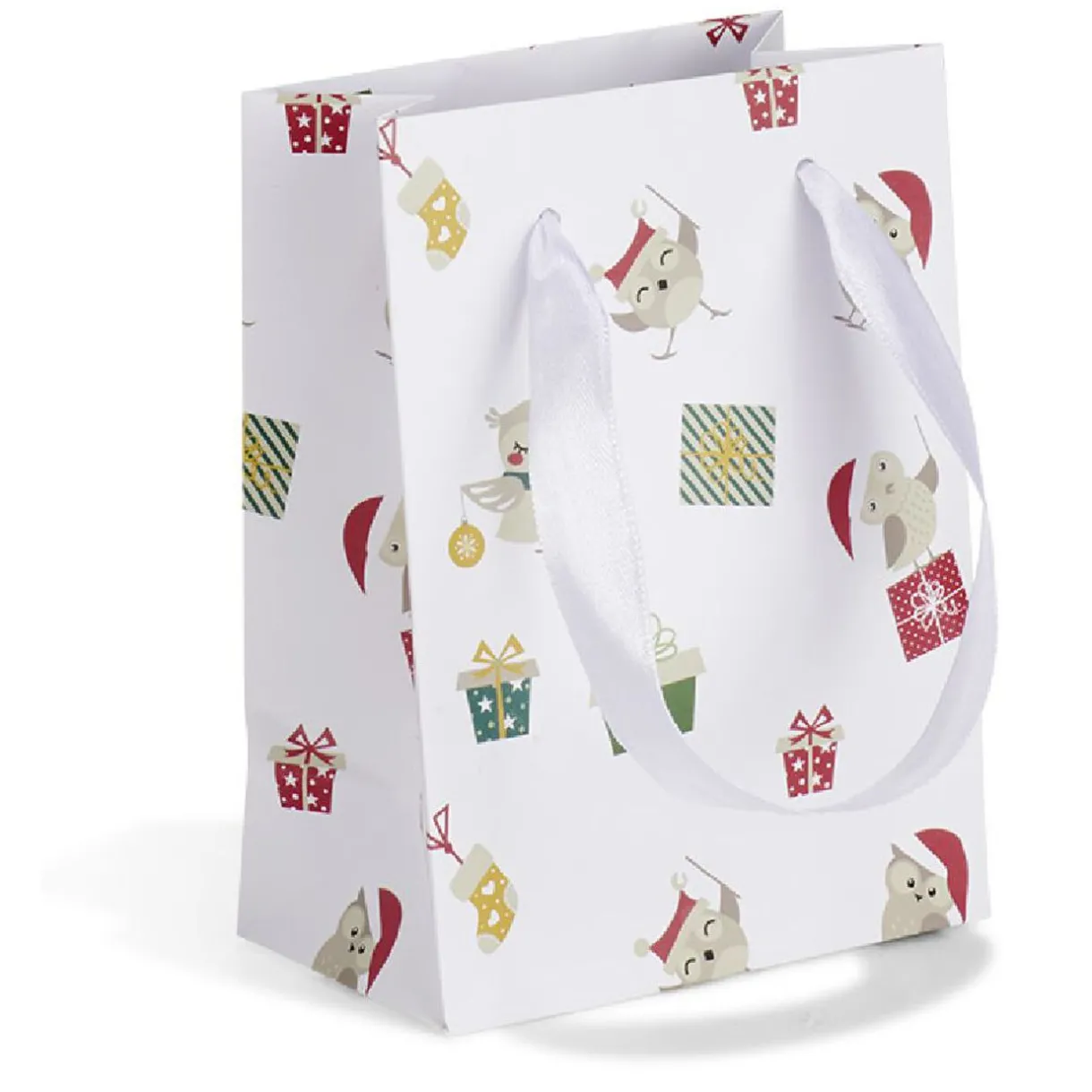 Sac cadeau de Noël taille S pour enfant, blanc avec des rennes, vert avec des pingouins ou rouge avec des faons.