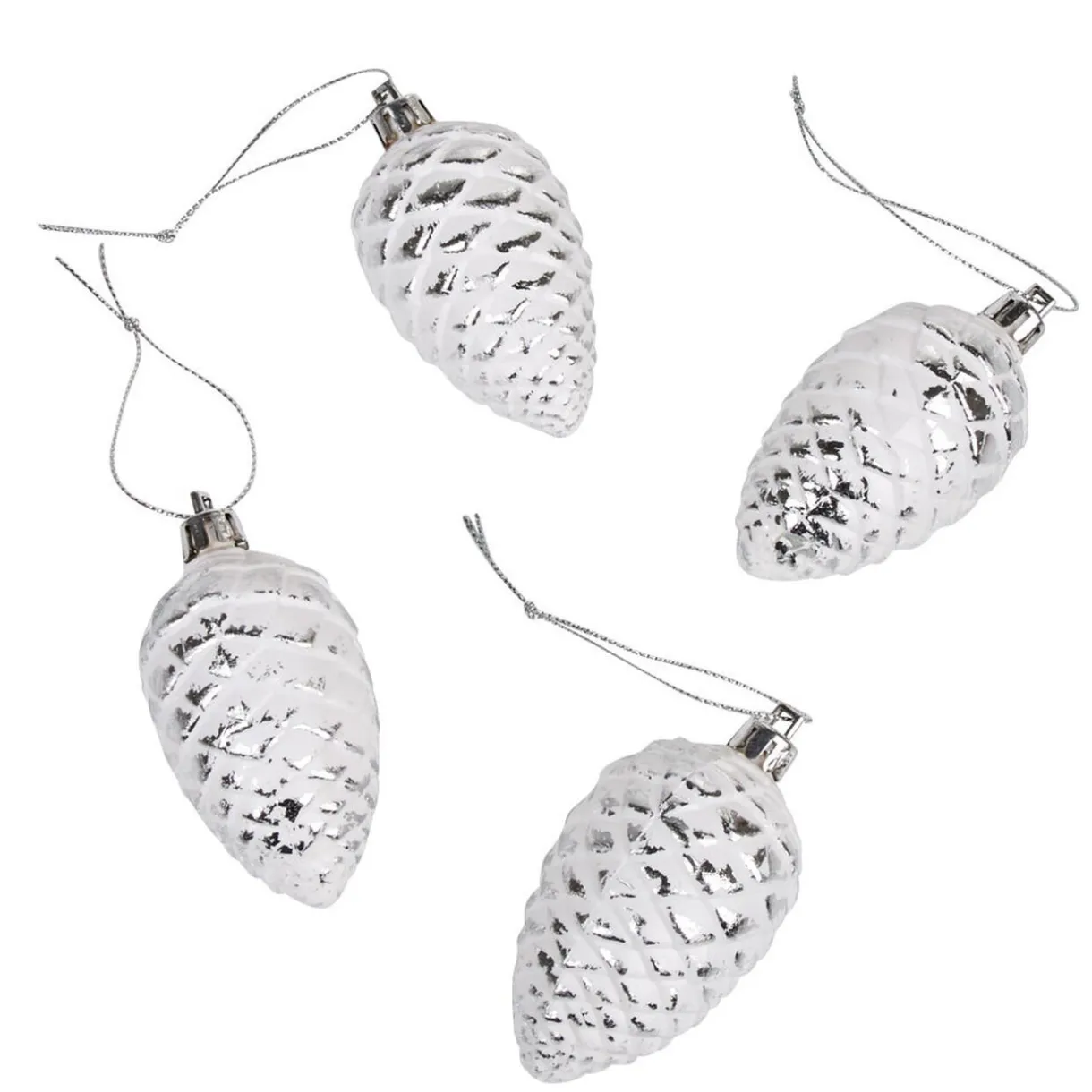 4 pommes de pin blanches et argentées à suspendre, h.7 cm, plastique.