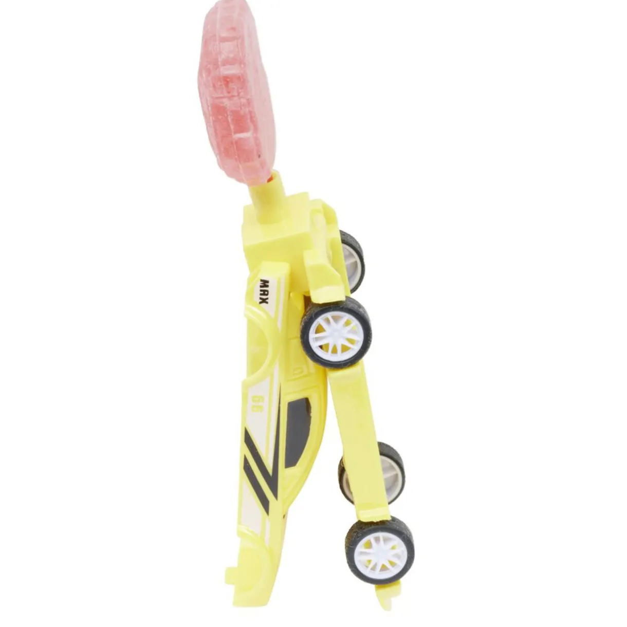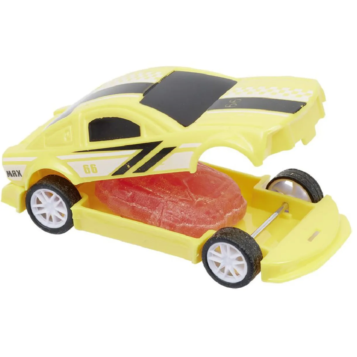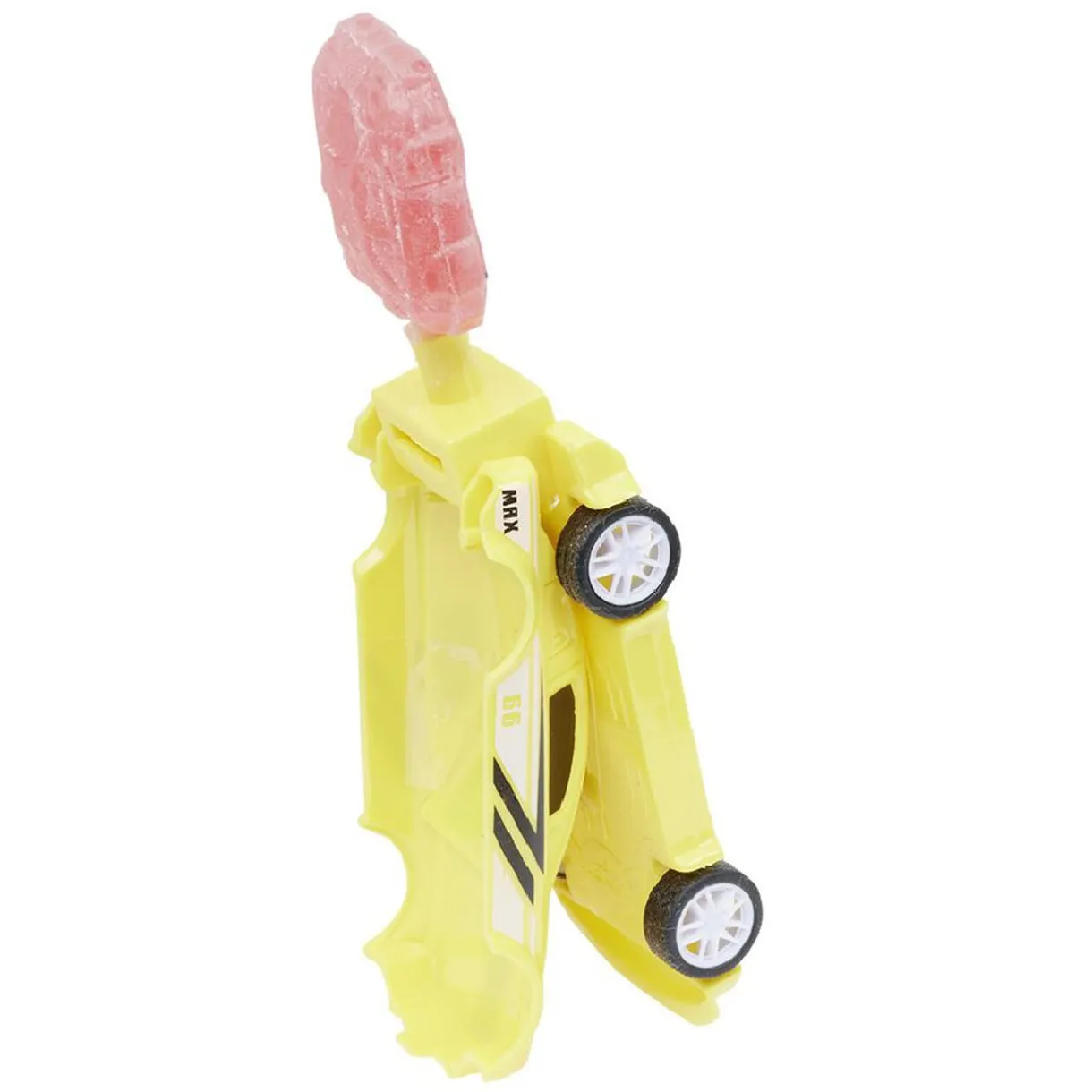 Sucette en forme de mini voiture avec un délicieux bonbon fruité à l’intérieur.