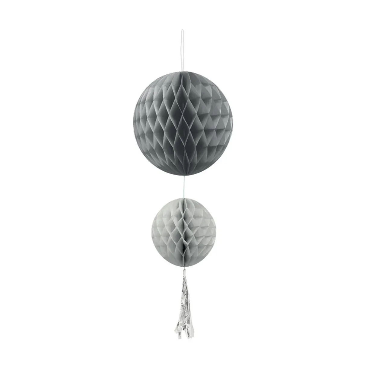 Suspension composée de 2 boules de tailles différentes en papier gris avec finition pompon .