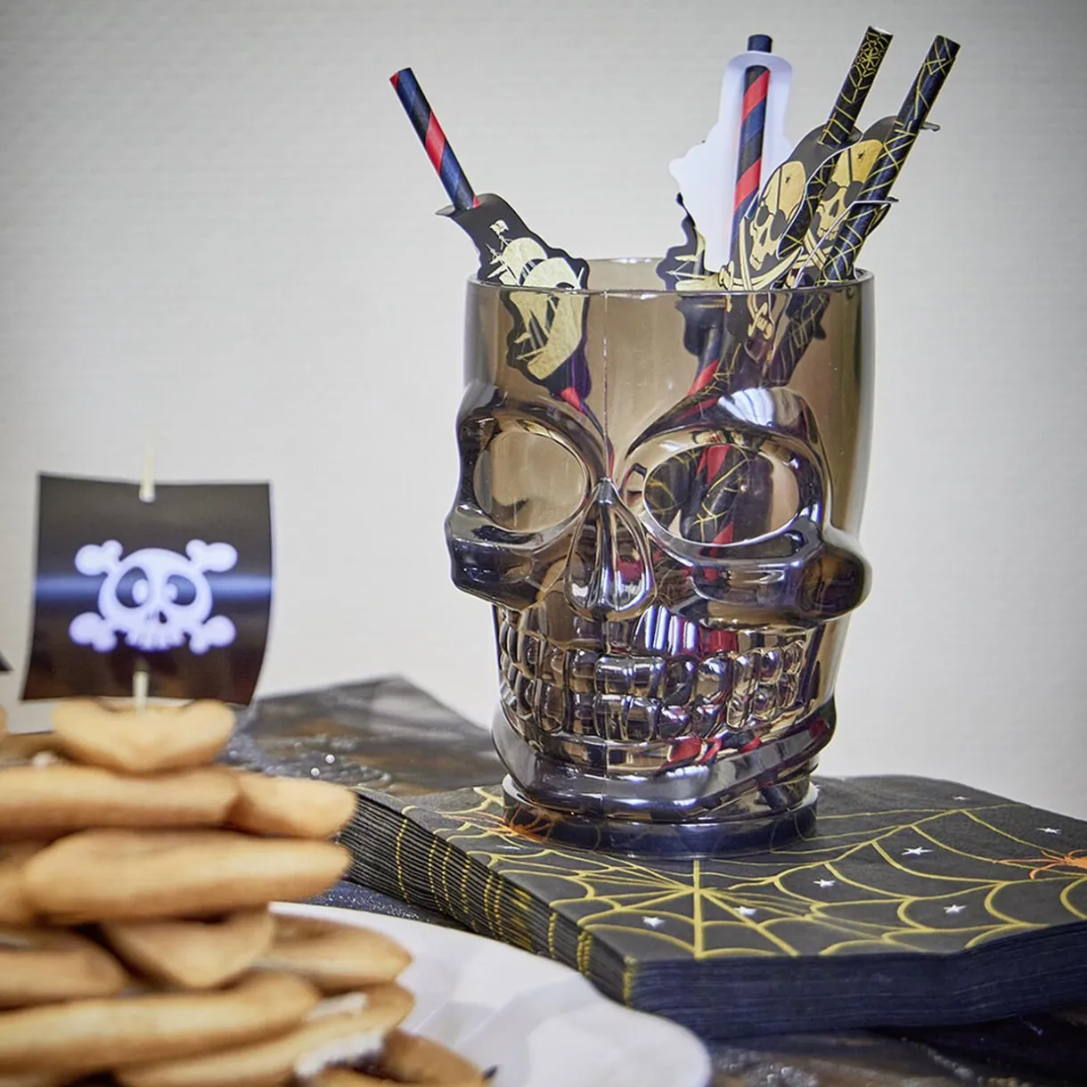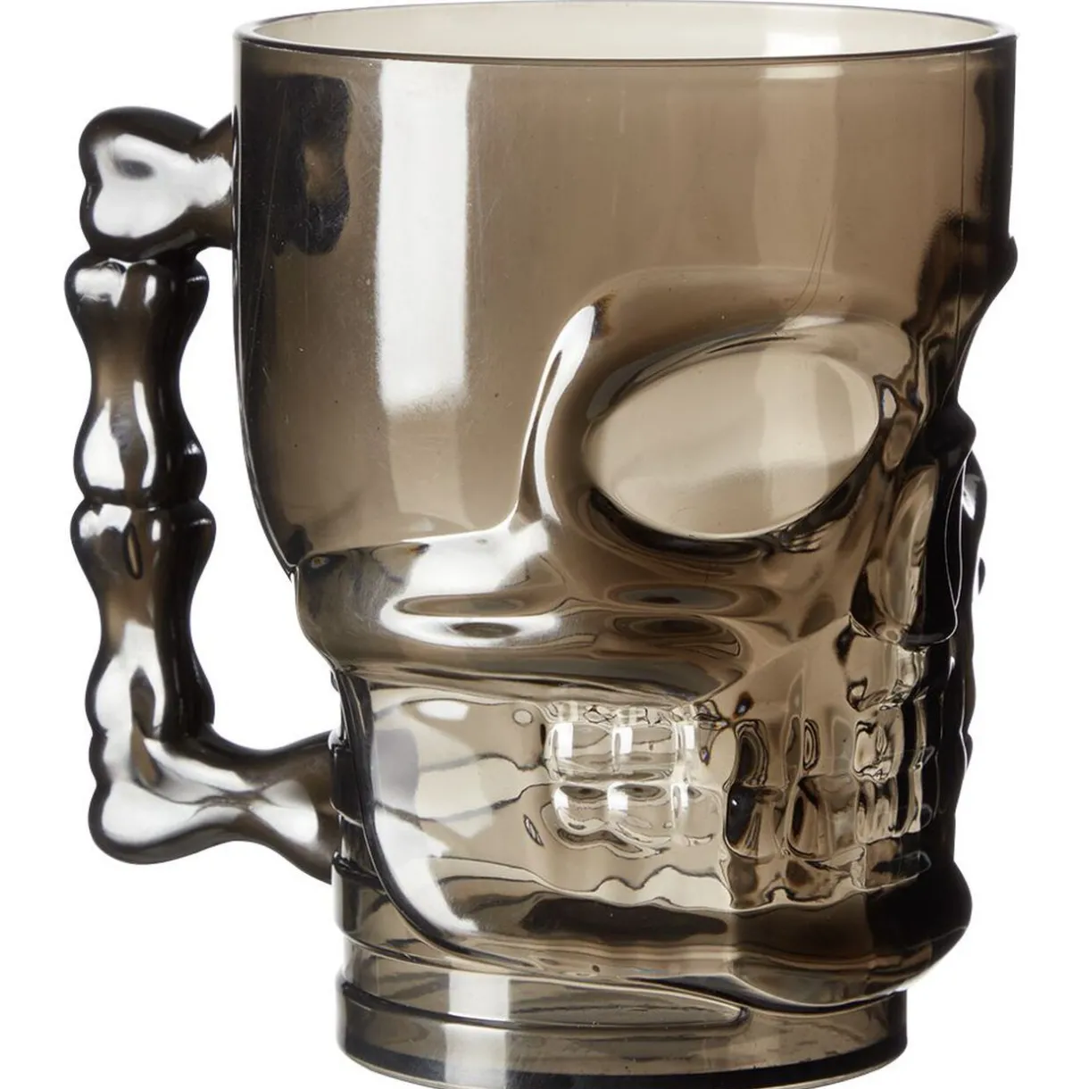Verre en plastique noir en forme de tête de mort, parfait pour servir à boire à l’occasion d’Halloween.