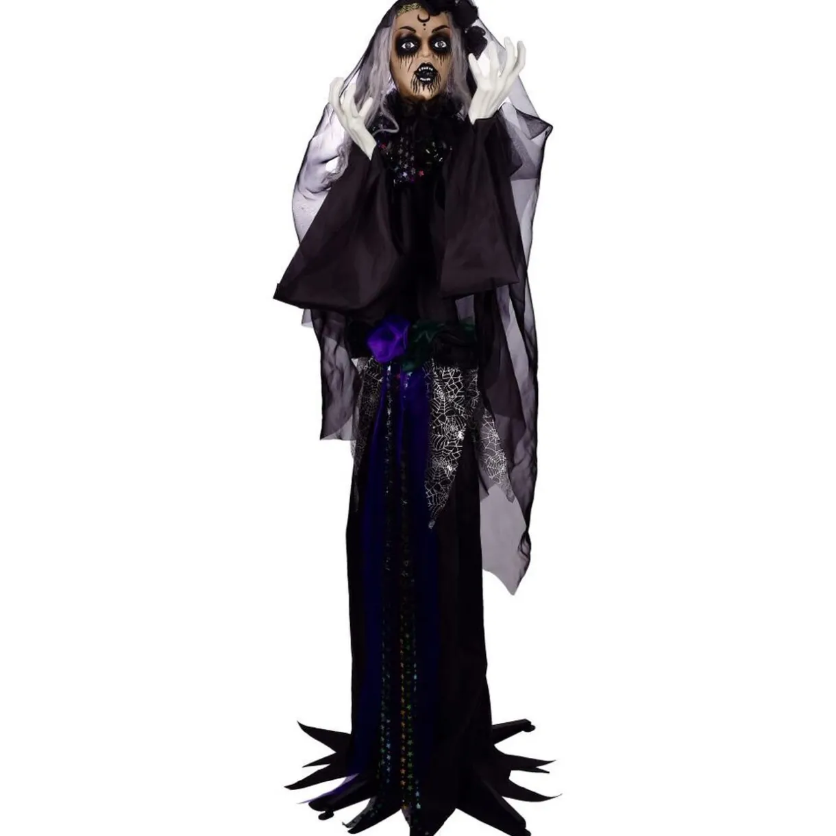 Ses longs cheveux gris tombent en mèches emmêlées autour d’elle, évoquant l’image d’une sorcière ancestrale.