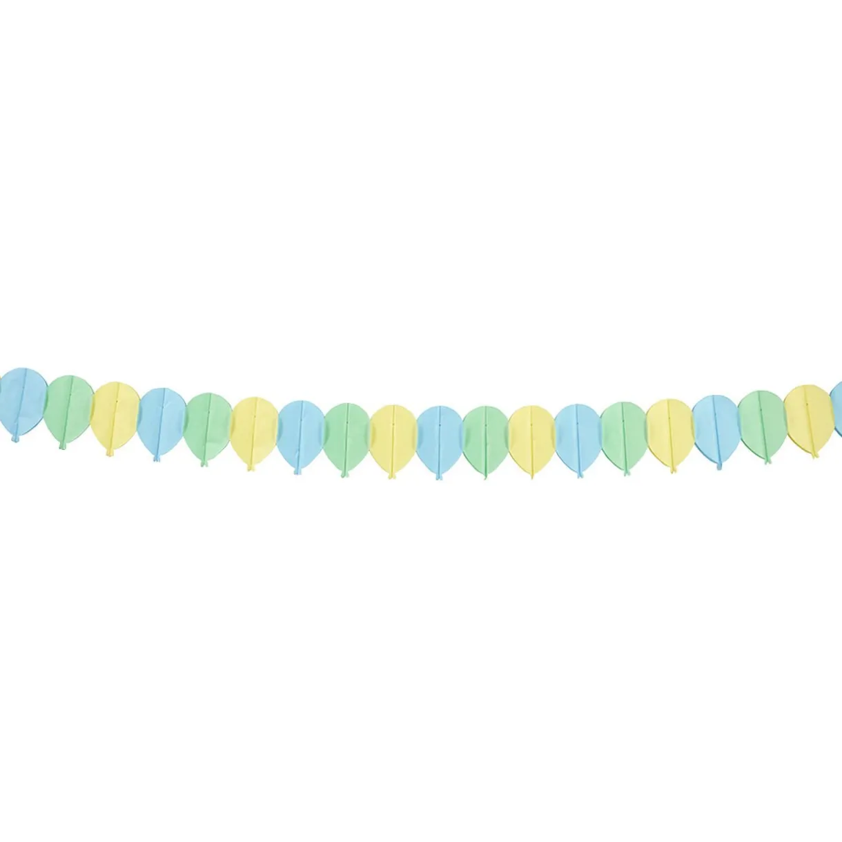 Décorez vos soirées avec cette jolie guirlande en papier en forme de ballons de couleur jaune, bleu et vert.